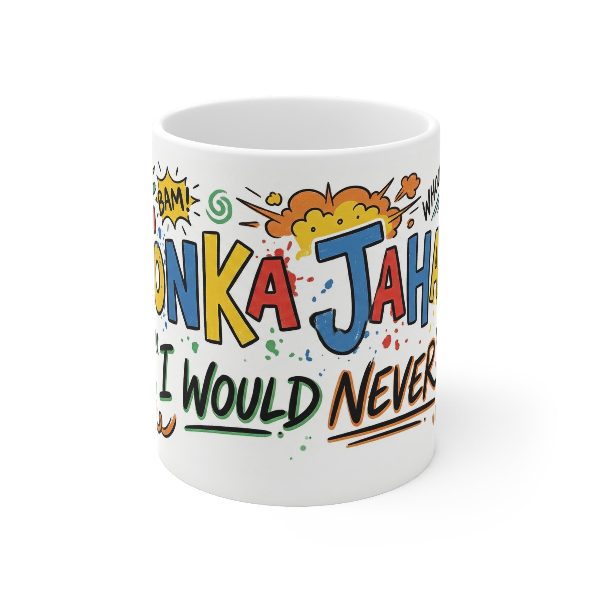This bright 11oz ceramic mug brings playful, comic-style energy to quiet mornings and late-night snack sessions. Colorful hand-drawn lettering and doodles wrap around the cup — pizza slices, sparkles, and explosive accents — creating a fun, irreverent vibe that lifts your coffee ritual. Comfortable C-handle and rounded edges make it easy to cradle while you read, game, or chat. Durable ORCA coating keeps the artwork vivid through daily use and dishwasher cycles, and the microwave-safe ceramic means you can reheat without fuss. It’s the kind of mug that starts conversations and nudges a smile with every sip.